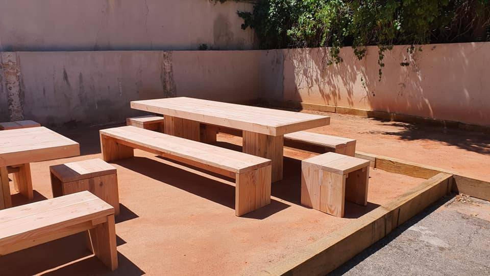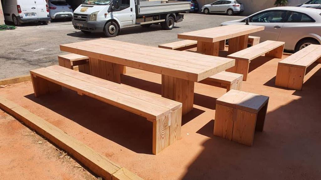 Des bois de 45x220mm et 45x145mm ont été façonnés, rabotage,délignage et mise à longueur afin de réaliser les différents organes des tables et bancs des ces 3 modules de pique nique.
