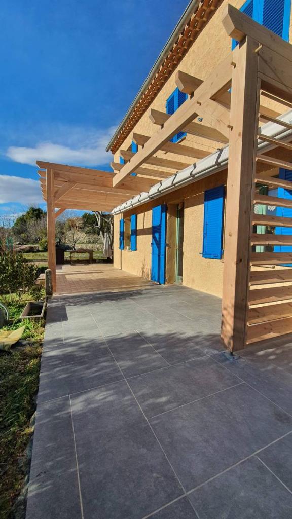 Concept Bois à conçus pour ce client de Varages dans le Var 83, une pergola en appui façade sur mesure de 8x4m.